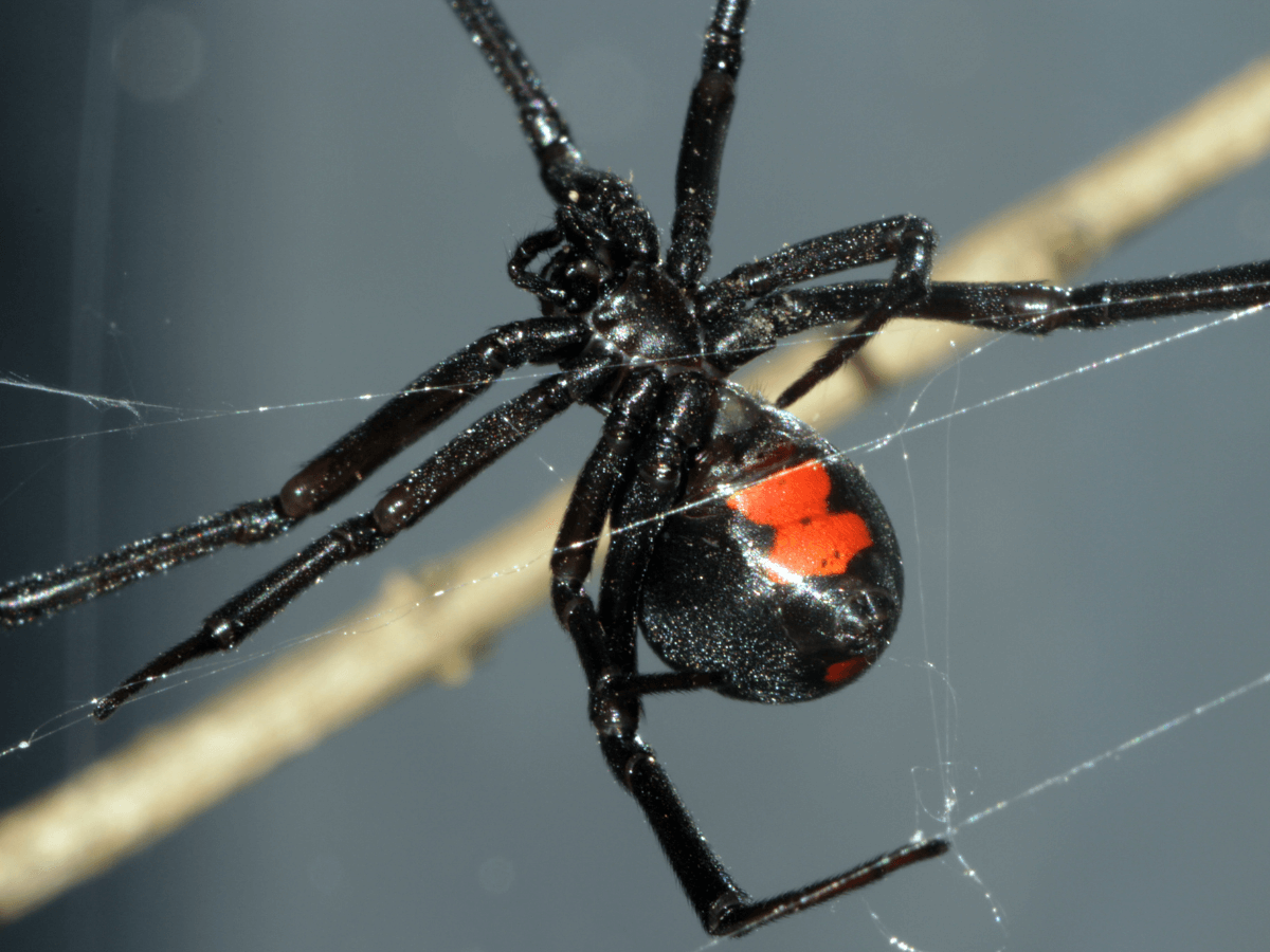 Another well-known spider, the female Black Widow, is easily identified by her shiny black body and the signature red hourglass marking on her abdomen. They build messy, irregular webs in sheltered locations like sheds, crawl spaces, and under outdoor furniture. Like the Brown Recluse, they are not aggressive and prefer to stay hidden.